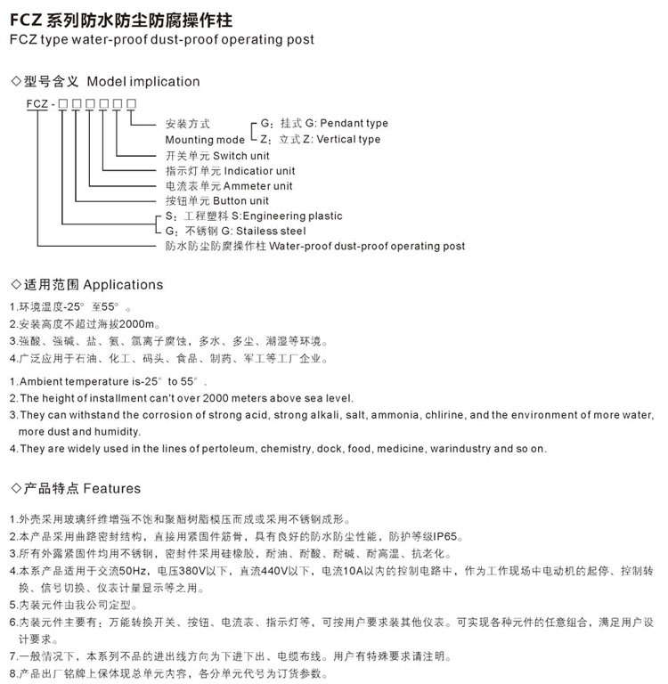 服務(wù)熱線:18368700777 產(chǎn)品中心 防爆操作柱 FCZ系列防水防塵防腐操作柱 防護(hù)等級(jí):IP65