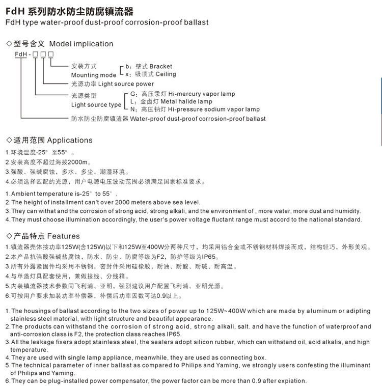 FdH系列防水防塵防腐鎮流器 防護等級:IP65